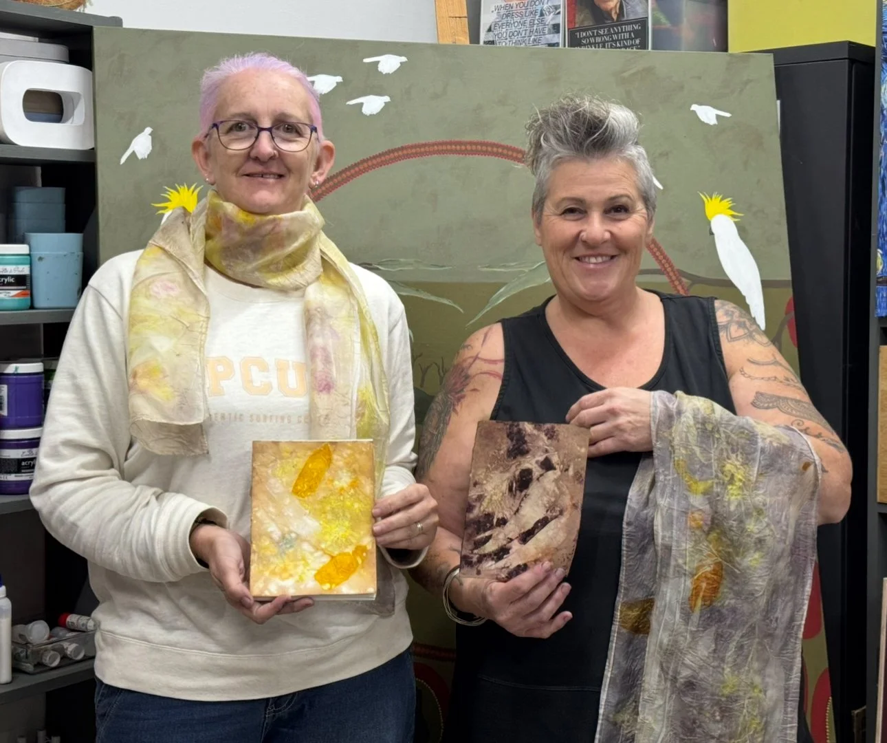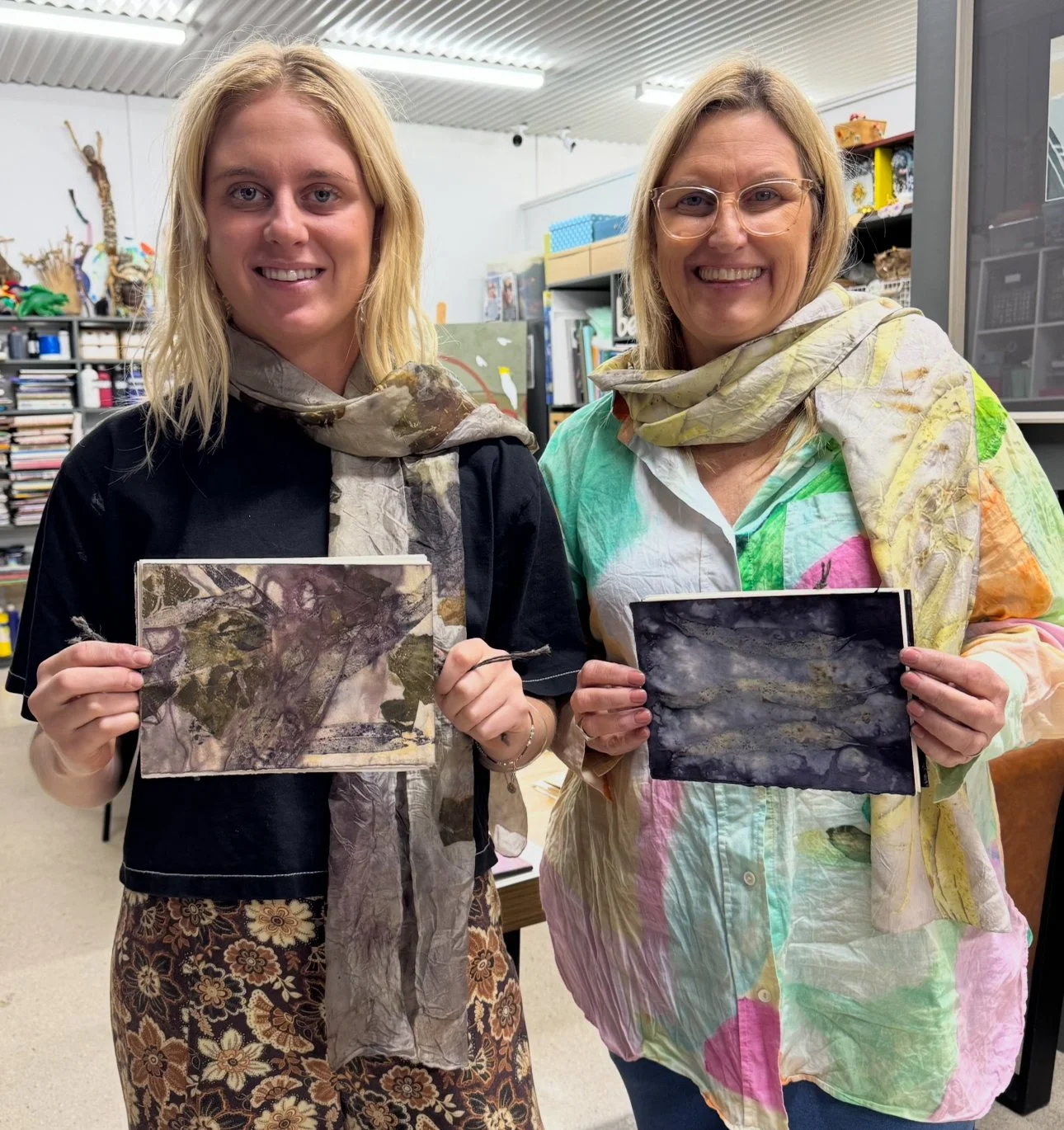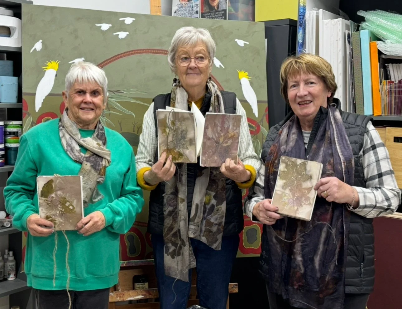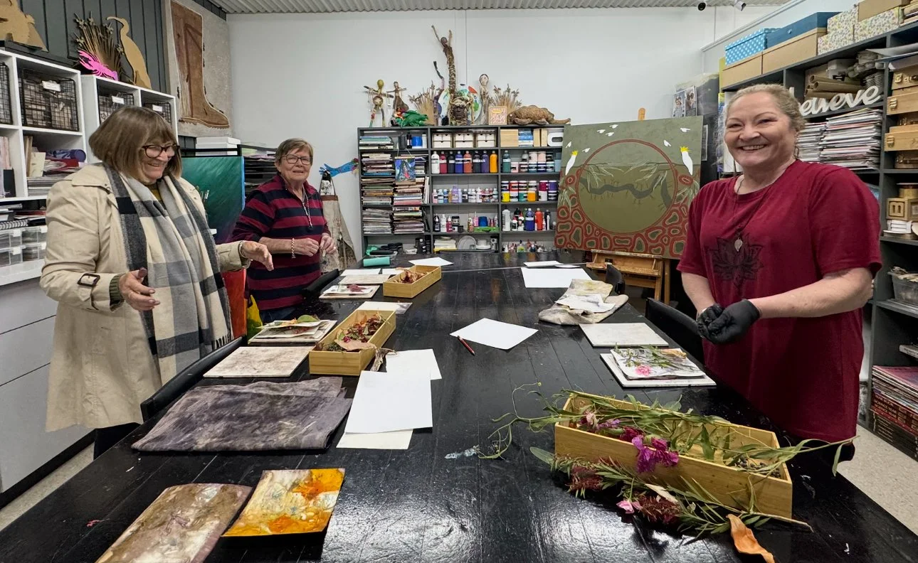 The second phase of the project continued independently at the Kerri Weymouth Art Gallery & Studio, where participants explored eco-dyeing, natural printing, and journal and scarf making. These workshops deepened creative expression through direct engagement with nature using leaves, bark, paper, and rusted metal to capture the organic beauty of the environment. This phase provided a calm, reflective space to experiment, connect with Country, and experience the therapeutic value of making.