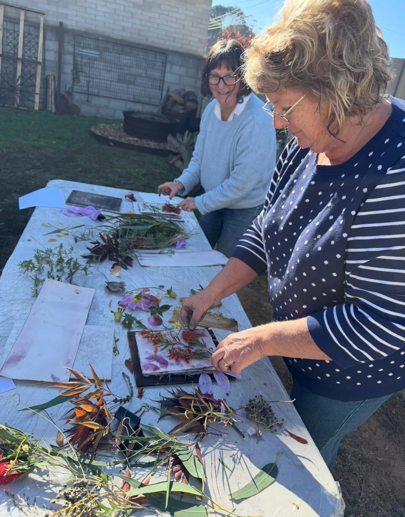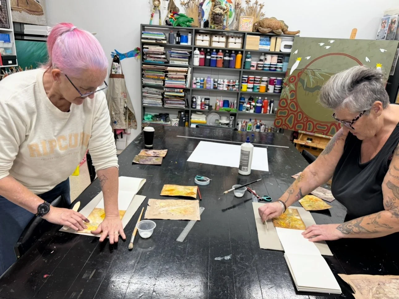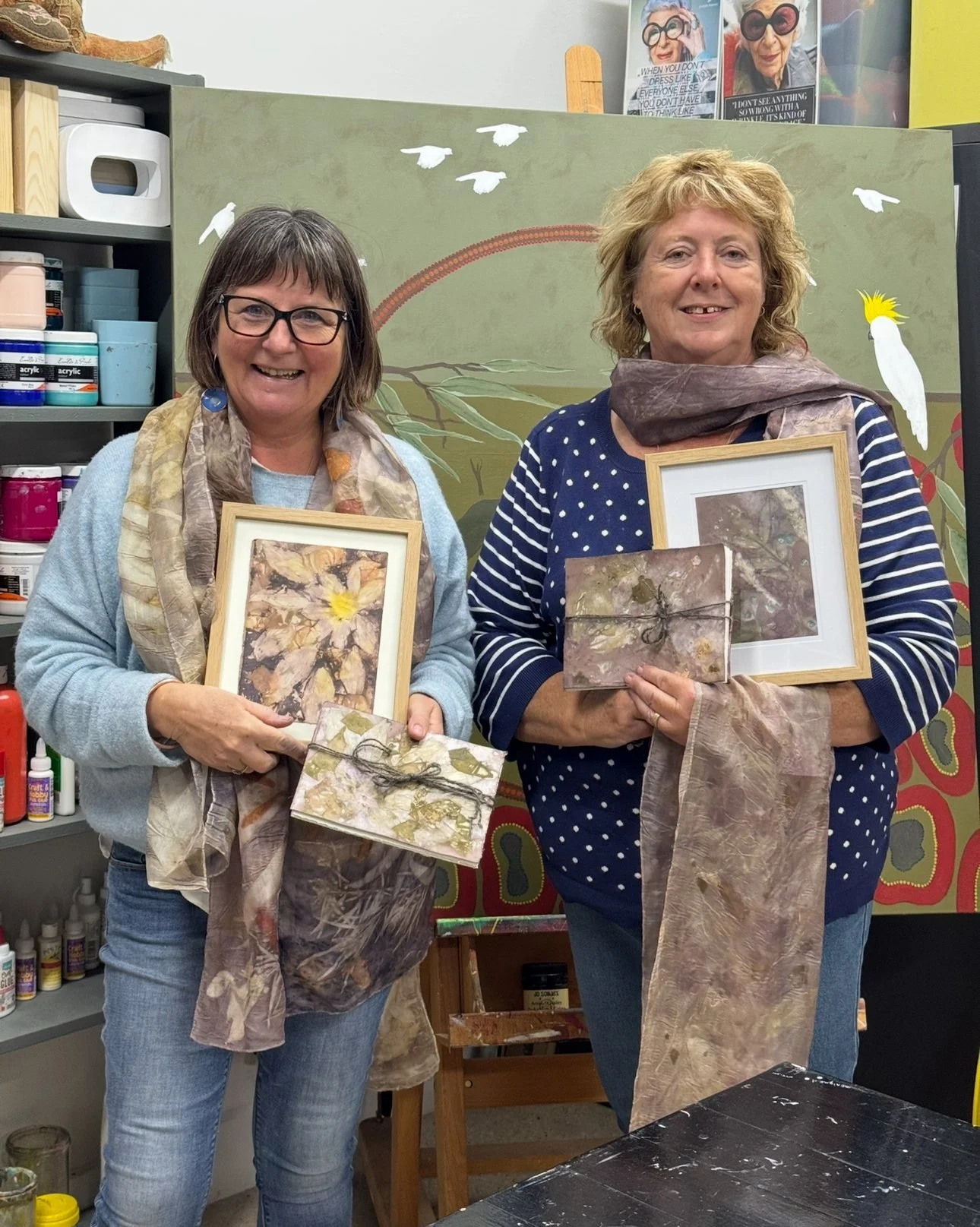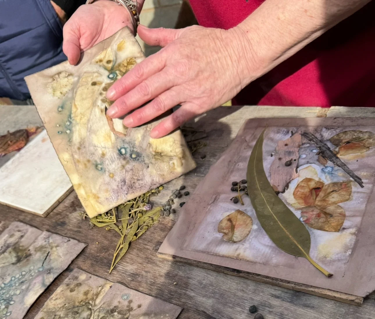 The second phase of the project continued independently at the Kerri Weymouth Art Gallery & Studio, where participants explored eco-dyeing, natural printing, and journal and scarf making. These workshops deepened creative expression through direct engagement with nature using leaves, bark, paper, and rusted metal to capture the organic beauty of the environment. This phase provided a calm, reflective space to experiment, connect with Country, and experience the therapeutic value of making.
