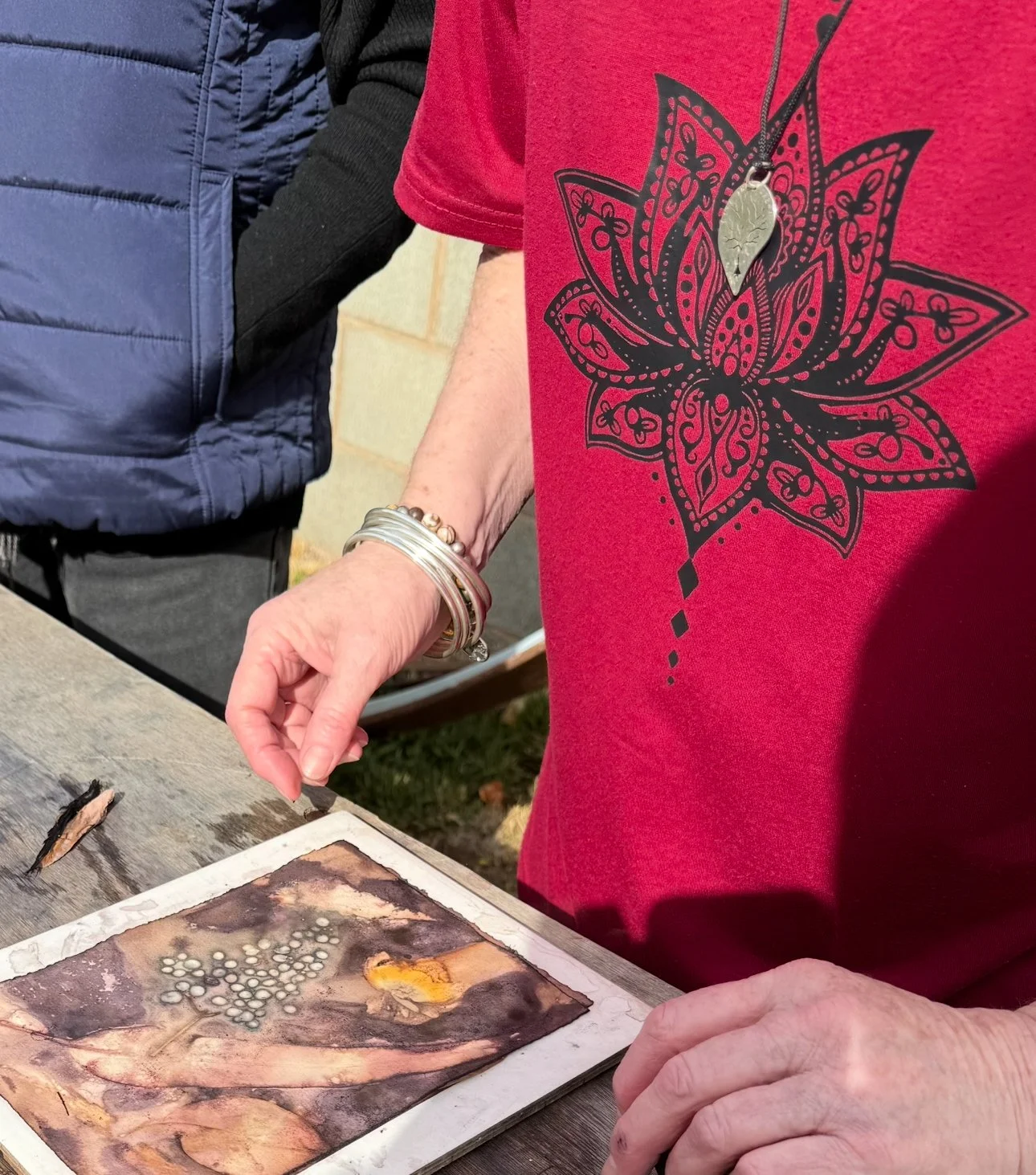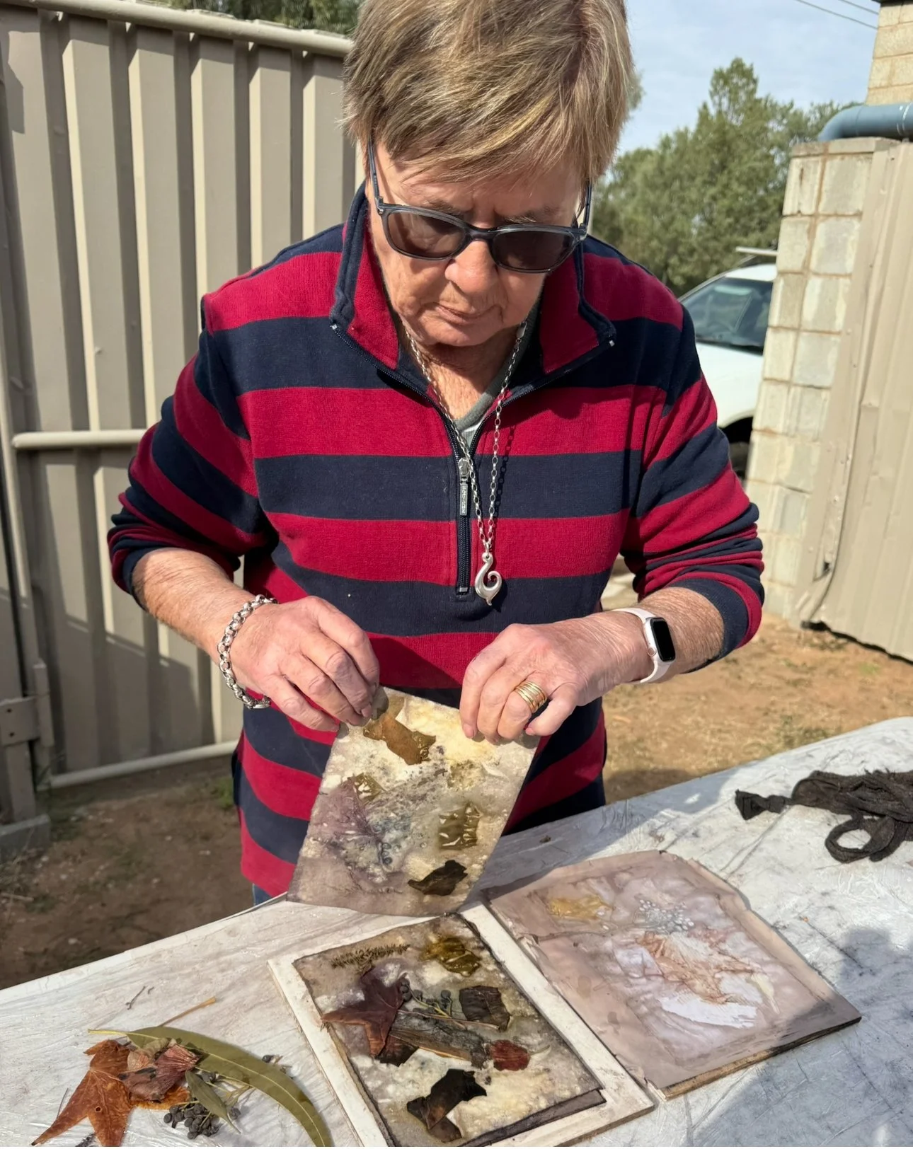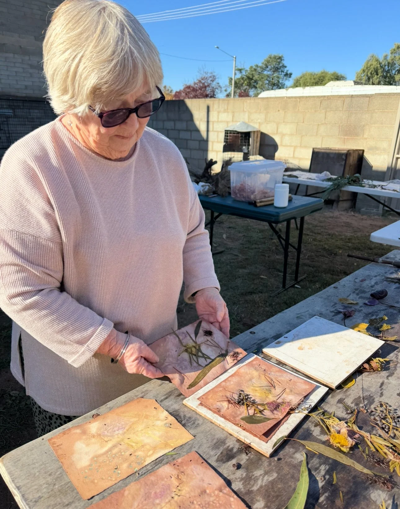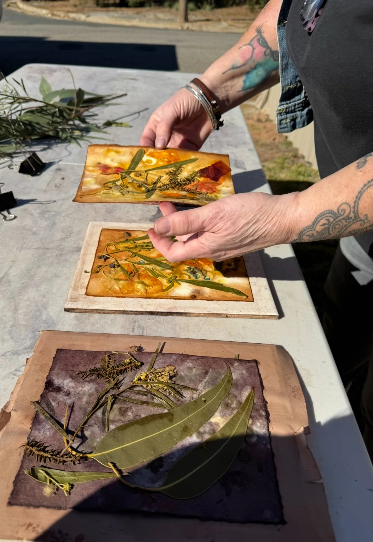 The second phase of the project continued independently at the Kerri Weymouth Art Gallery & Studio, where participants explored eco-dyeing, natural printing, and journal and scarf making. These workshops deepened creative expression through direct engagement with nature using leaves, bark, paper, and rusted metal to capture the organic beauty of the environment. This phase provided a calm, reflective space to experiment, connect with Country, and experience the therapeutic value of making.
